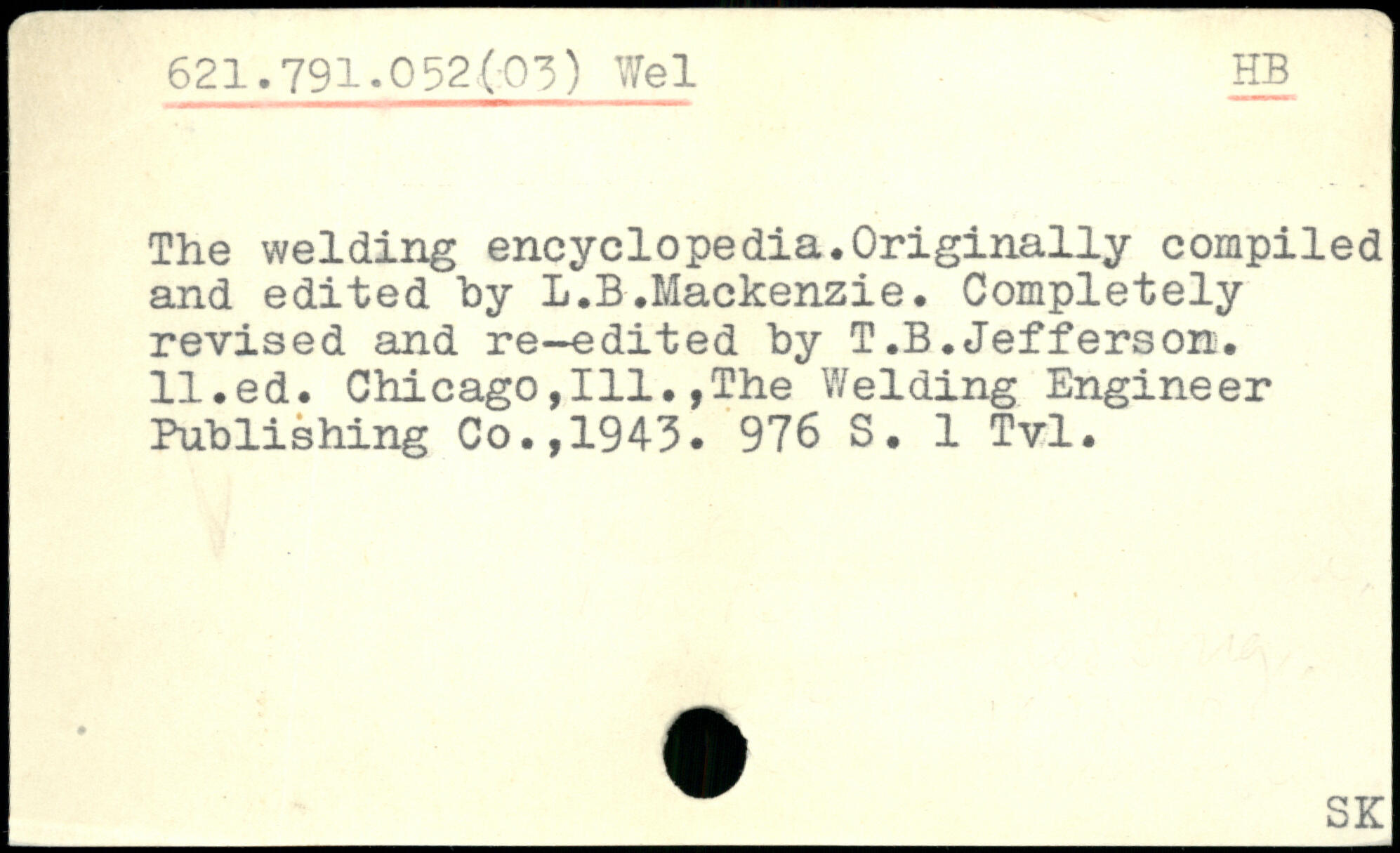 The welding encyclopedia.Originally compiled and edited by L.B.Mackenzie. Completely revised and re-edited by T.B.Jefferson.