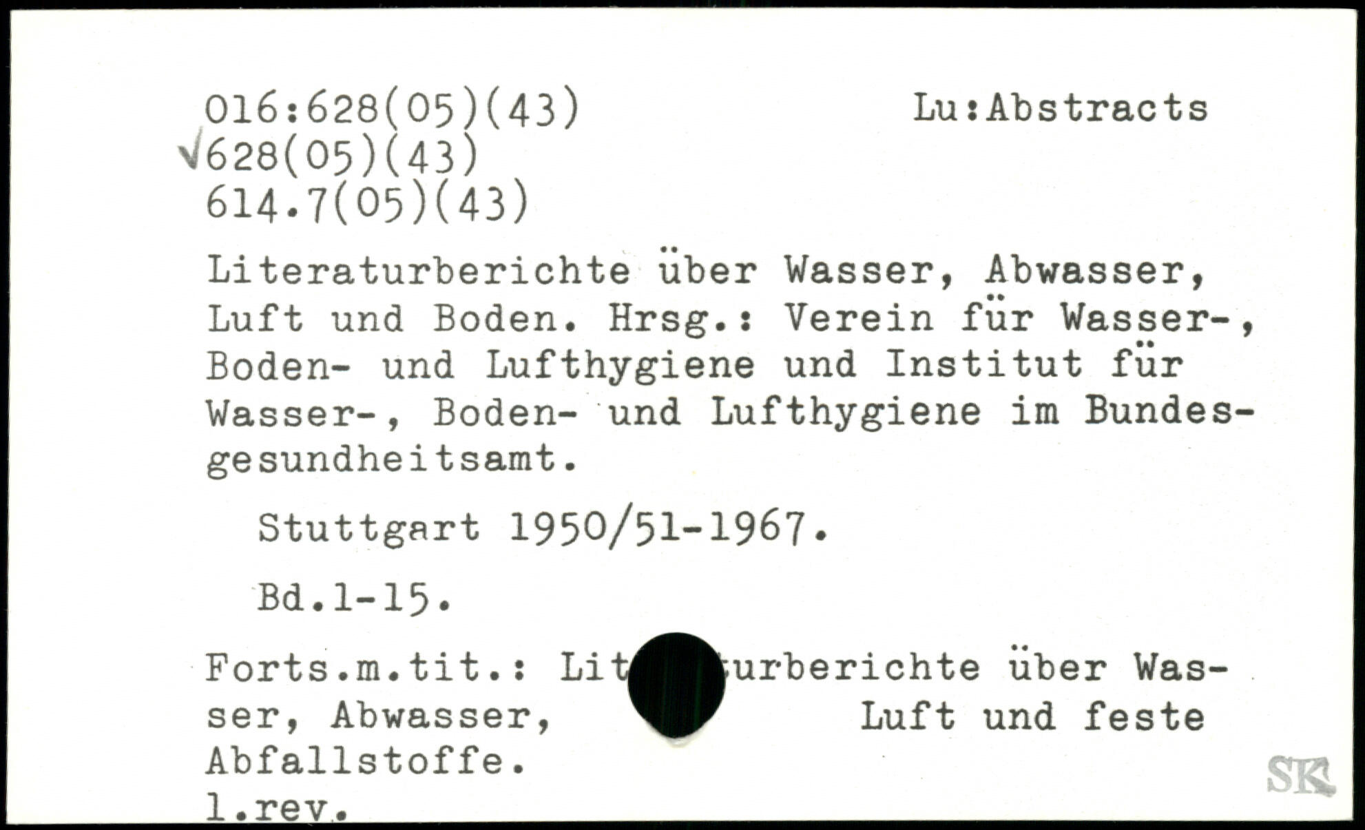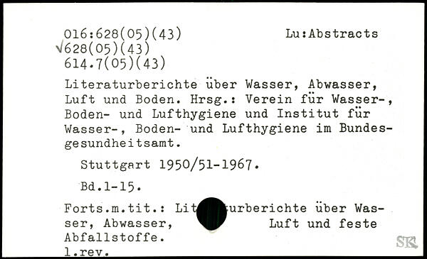 Literaturberichte über Wasser, Abwasser, Luft und Boden. Hrsg.: Verein für Wasser-, Boden- und Lufthygiene und Institut für Wasser-, Boden- und Lufthygiene im Bundesgesundheitsamt.