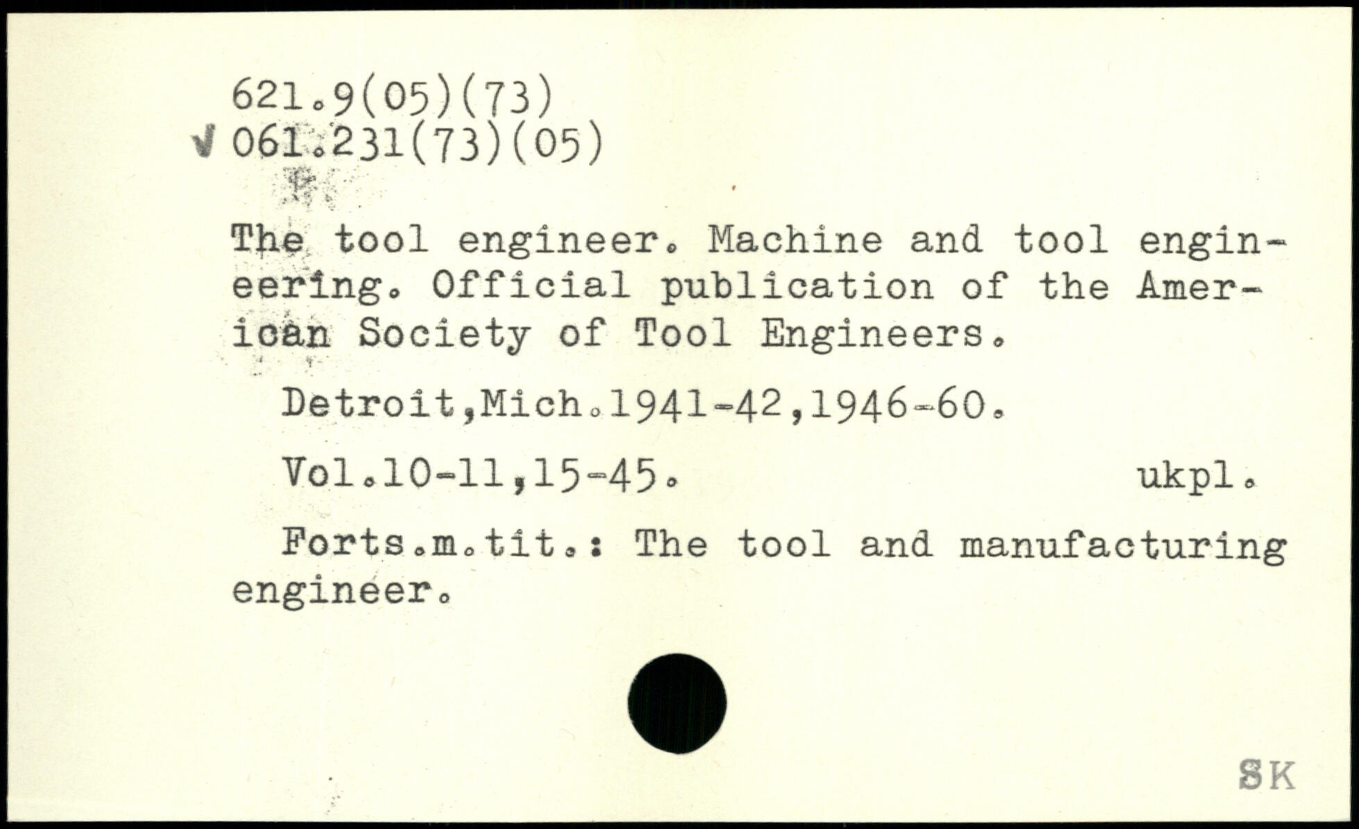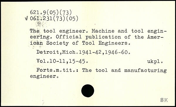 The tool engineer. Machine and tool engineering. Official publication of the American Society of Tool Engineers. Detroit,Mich.1941-42,1946-60, Yol.10-11,15-45® ukpl, Forts,m.tit.: The tool and manufacturing engineer.