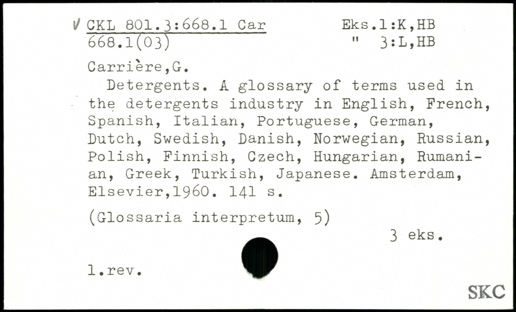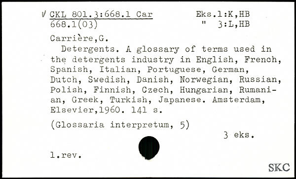 Detergents. A glossary of terms used in the detergents industry in English, French, Spanish, Italian, Portuguese, German, Dutch, Swedish, Danish, Norwegian, Russian, Polish, Finnish, Czech, Hungarian, Rumanian, Greek, Turkish, Japanese.