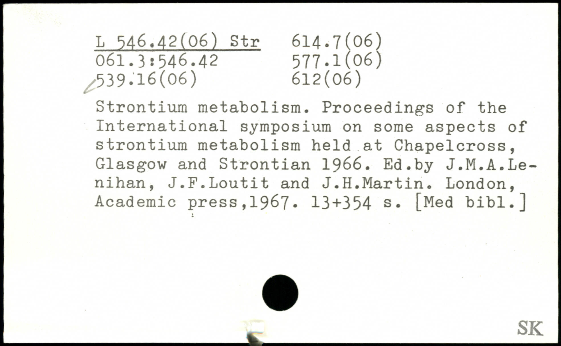 Strontium metabolism. Proceedings of the International symposium on some aspects of strontium metabolism held at Chapelcross, Glasgow and Strontian 1966. Ed.by J.M.A.Le-nihan, J.F.Loutit and J.H.Martin.