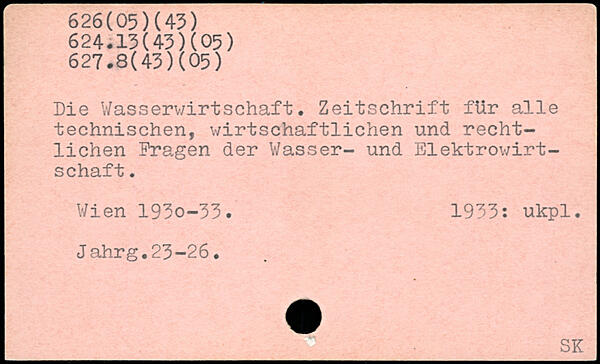 Die Wasserwirtschaft. Zeitschrift für alle technischen, wirtschaftlichen und rechtlichen Fragen der Wasser- und Elektrowirtschaft. Wien 193o-33. 1933: ukpl. Jahrg.23-26.