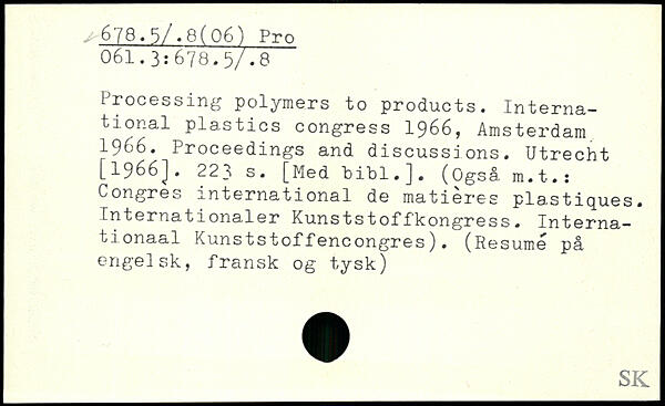 Processing polymers to products. International plastics congress 1966, Amsterdam 1966. Proceedings and discussions. Utrecht L1966j.