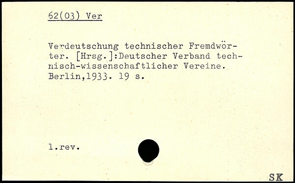 Verdeutschung technischer Fremdwörter. [Hrsg.]:Deutscher Verband tech-nisch-wissenschaftlicher Vereine. Berlin,1933.