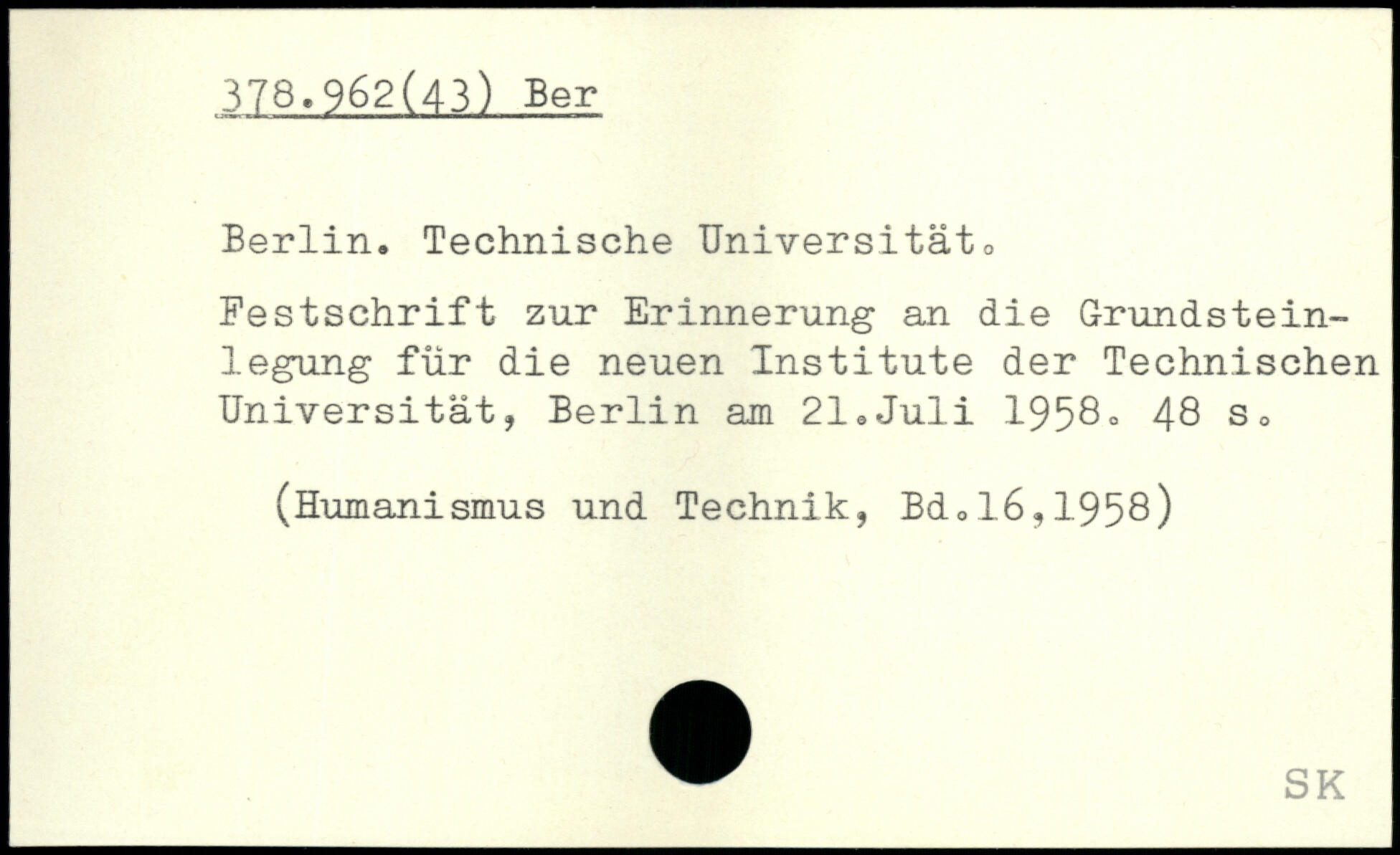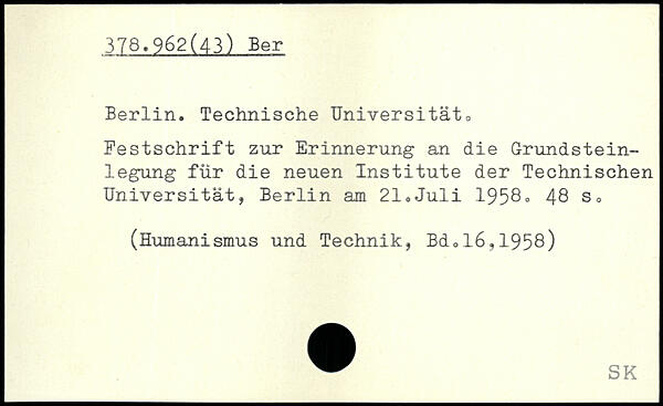 Berlin. Technische Universität0 Festschrift zur Erinnerung an die Grundsteinlegung für die neuen Institute der Technischen Universität, Berlin am 21.Juli 1958.