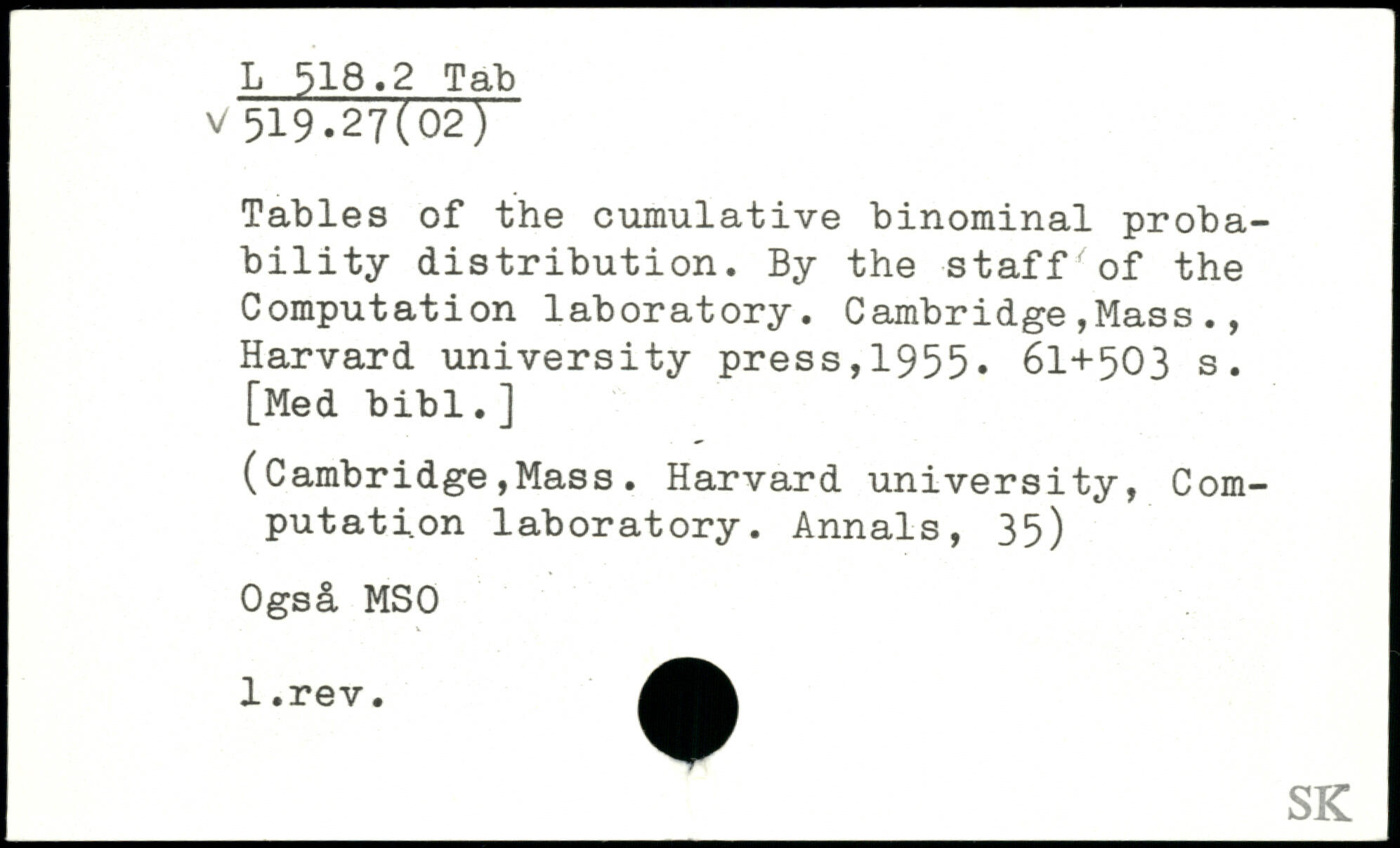 Tables of the cumulative binominal probability distribution. By the staff' of the Computation laboratory.
