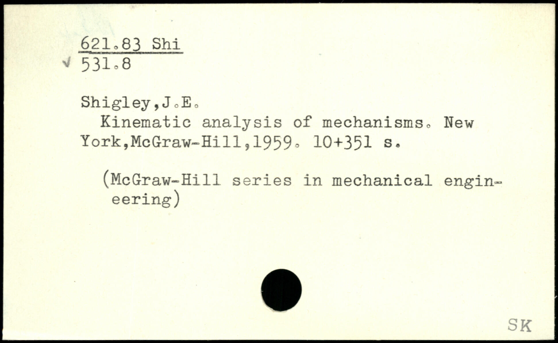Shigley,JcE, Kinematic analysis of mechanisms, New York,McGraw-Hill,1959. 10+351 s. (McGraw-Hill series in mechanical engin- \ eering)
