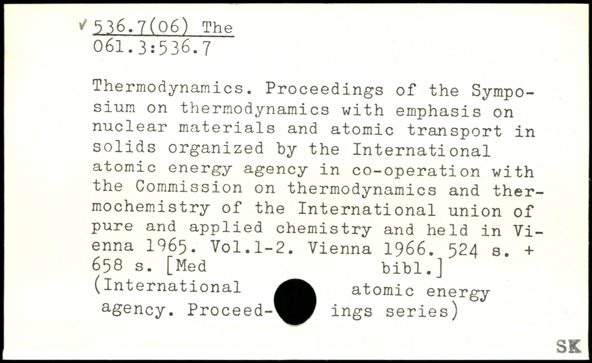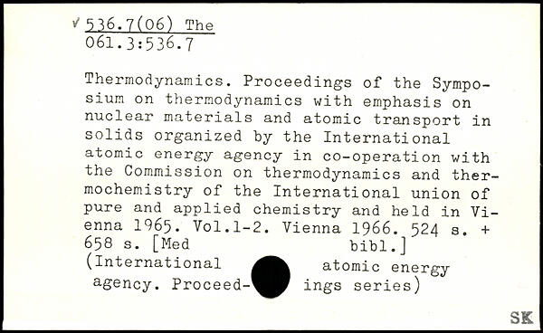 Thermodynamics. Proceedings of the Symposium on thermodynamics with emphasis on nuclear materials and atomic transport in solids organized by the International atomic energy agency in co-operation with the Commission on thermodynamics and thermochemistry of the International union of pure and applied chemistry and held in Vienna 1965.