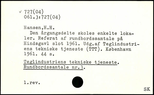 Den årgangsdelte skoles enkelte lokaler, Referat af rundbordssamtale på Hindsgavl slot 1961. Udg.af Teglindustriens tekniske tjeneste (TTT).