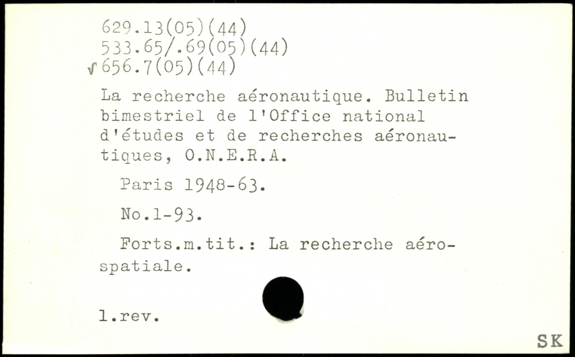 La recherche aéronautique. Bulletin bimestriel de l'Office national d'études et de recherches aéronautiques, O.N.E.R.À. Paris 194B-63. No.1-93. Ports.m.tit.: La recherche aérospatiale.