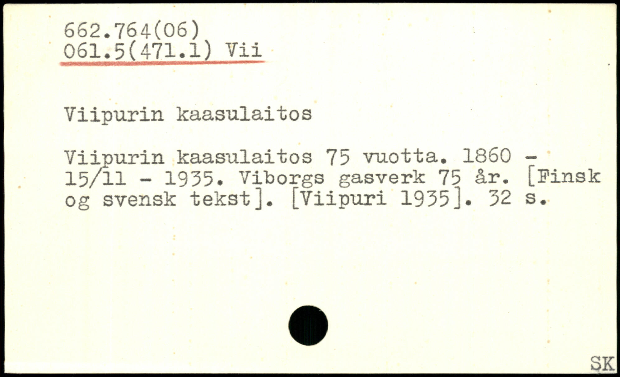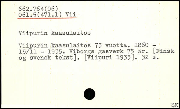 Viipurin kaasulaitos Viipurin kaasulaitos 75 vuotta. 1860 -15/11 - 1955. Viborgs gasverk 75 år. [Finsk og svensk tekst]. [Viipuri 1955].