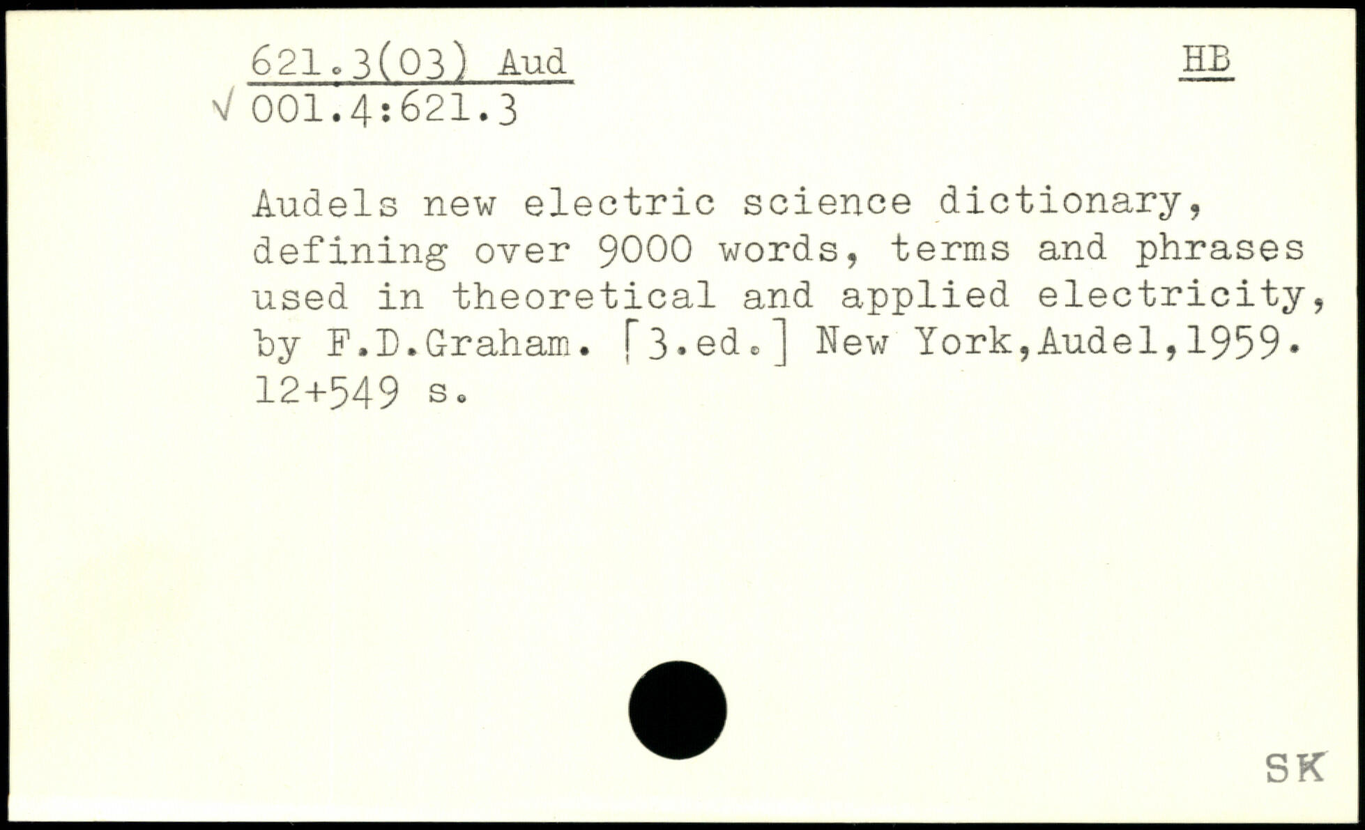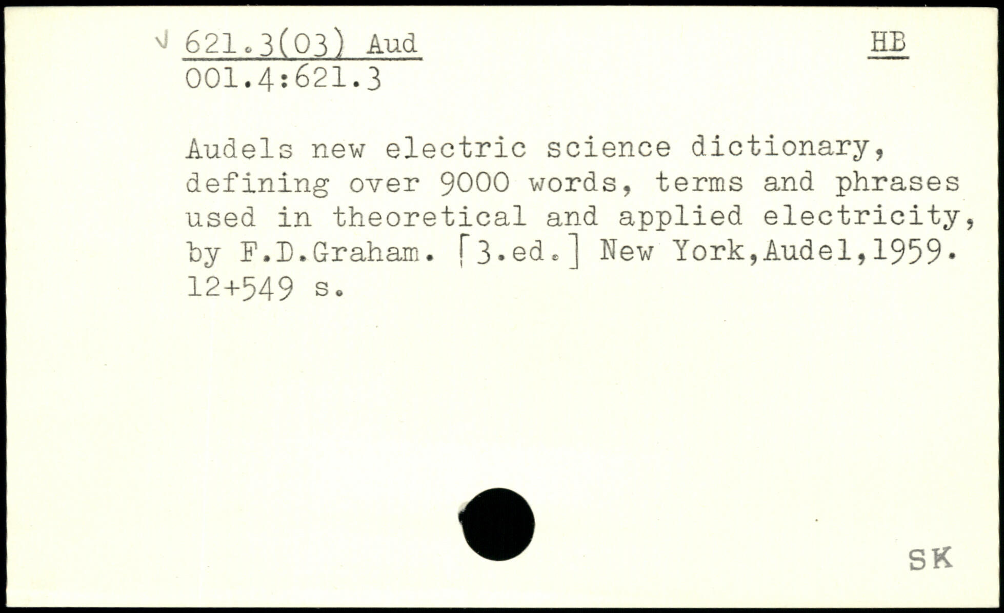 Audels new electric science dictionary, defining over 9000 words, terms and phrases used in theoretical and applied electricity, hy F.D.Graham.