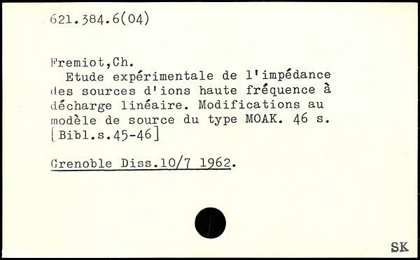 }''remiot ,Ch. Etude expérimentale de 1.impedance des sources d!ions haute fréquence a décharge linéaire. Modifications au modèle de source du type MOAK.