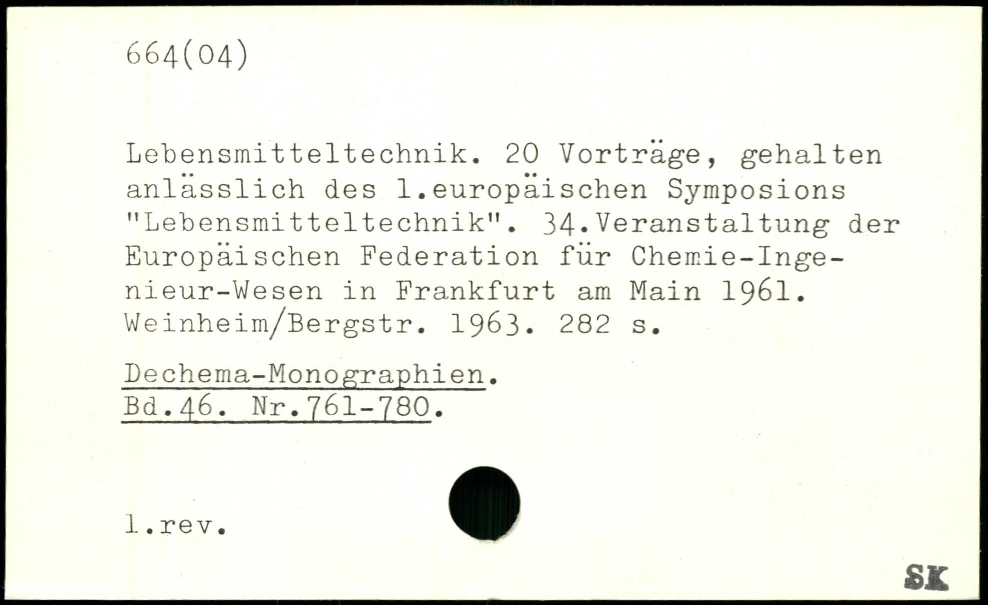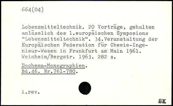 Lebensmitteltechnik. 20 Vorträge, gehalten anlässlich des 1.europäischen Symposions "Lebensmitteltechnik". 34.Veranstaltung der Europäischen Federation für Chemie-Inge-nieur-Wesen in