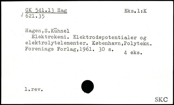 Hagen,S.Kiihnel Elektrokemi. Elektrodepotentialer og elektrolytelementer. København,Polytekn. Forenings Forlag,1961.
