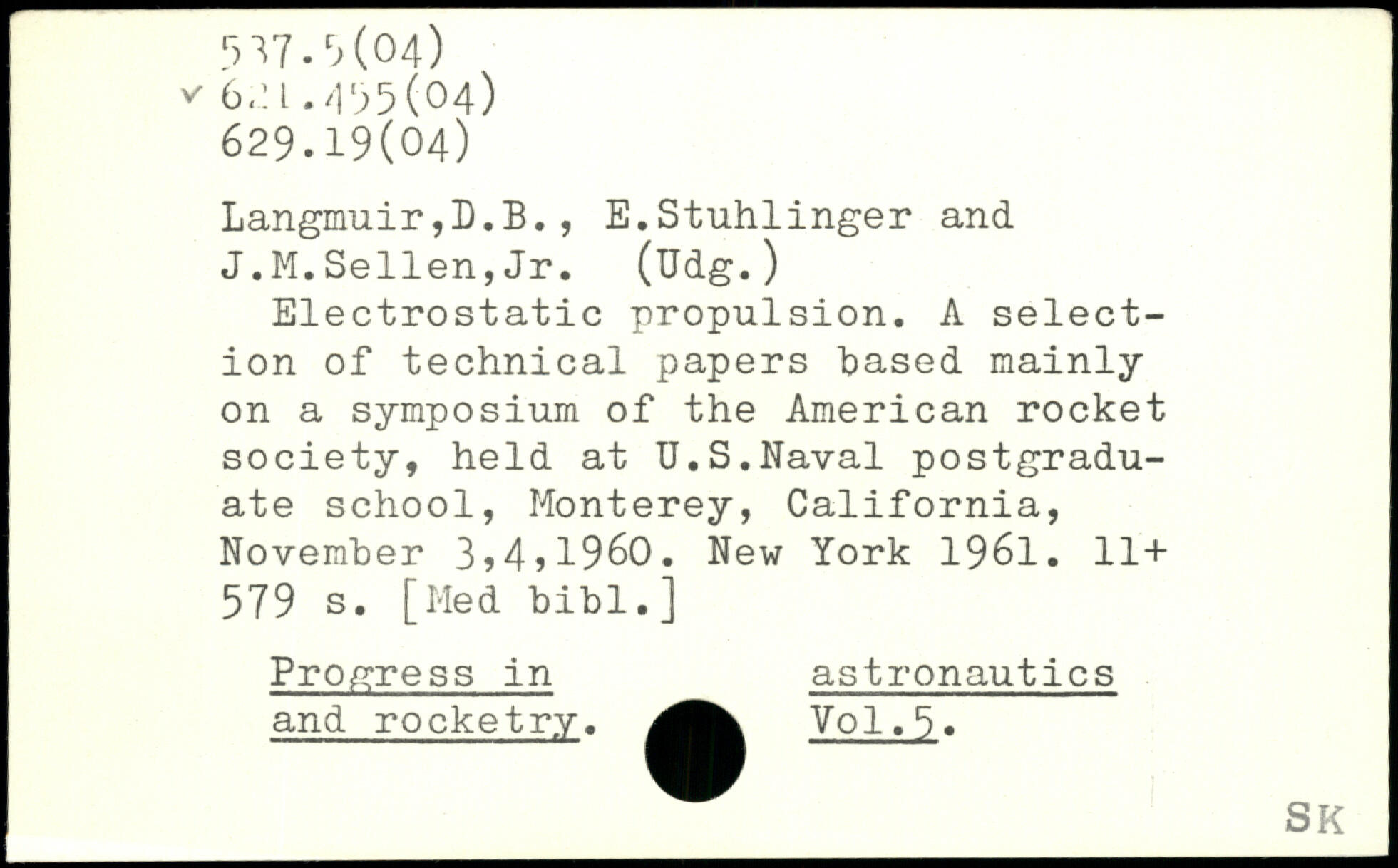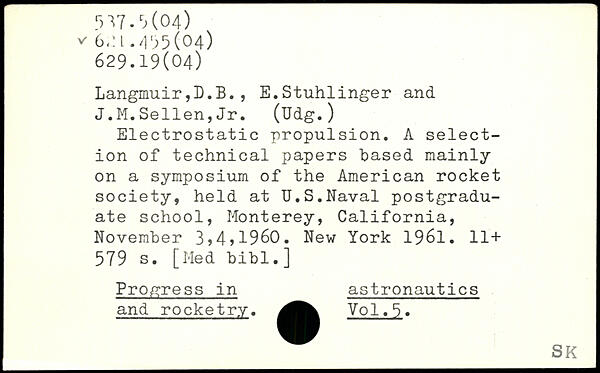 Langmuir,D.B., E.Stuhlinger and J.M.Sellen,Jr. (Udg.) Electrostatic propulsion. A selection of technical papers based mainly on a symposium of the American rocket society, held at U.S.Naval postgraduate school, Monterey, California, November 3>4>1960.