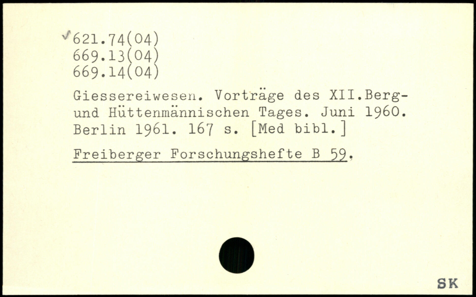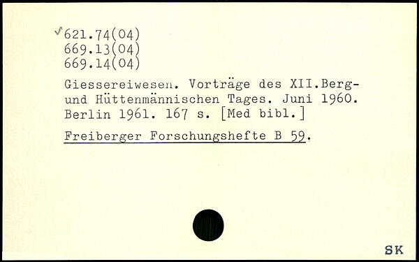 Giessereiwesen. Vortrage des XII.Berg-und Hüttenmännischen Tages. Juni 1960.
