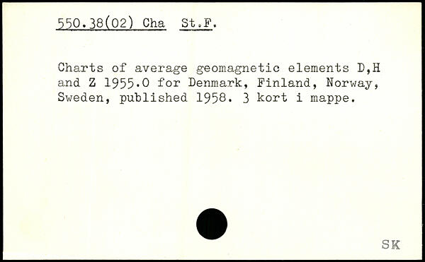 Charts of average geomagnetic elements D,H and Z 1955.0 for Denmark, Finland, Norway, Sweden, published 1958. 3 kort i mappe.