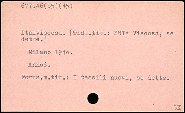 Italviscosa. [Tidl.tit.: SNIA Viscosa, se dette. ] Milano 194o. Anno6. Forts.m.tit.: I tessili nuovi, se dette.