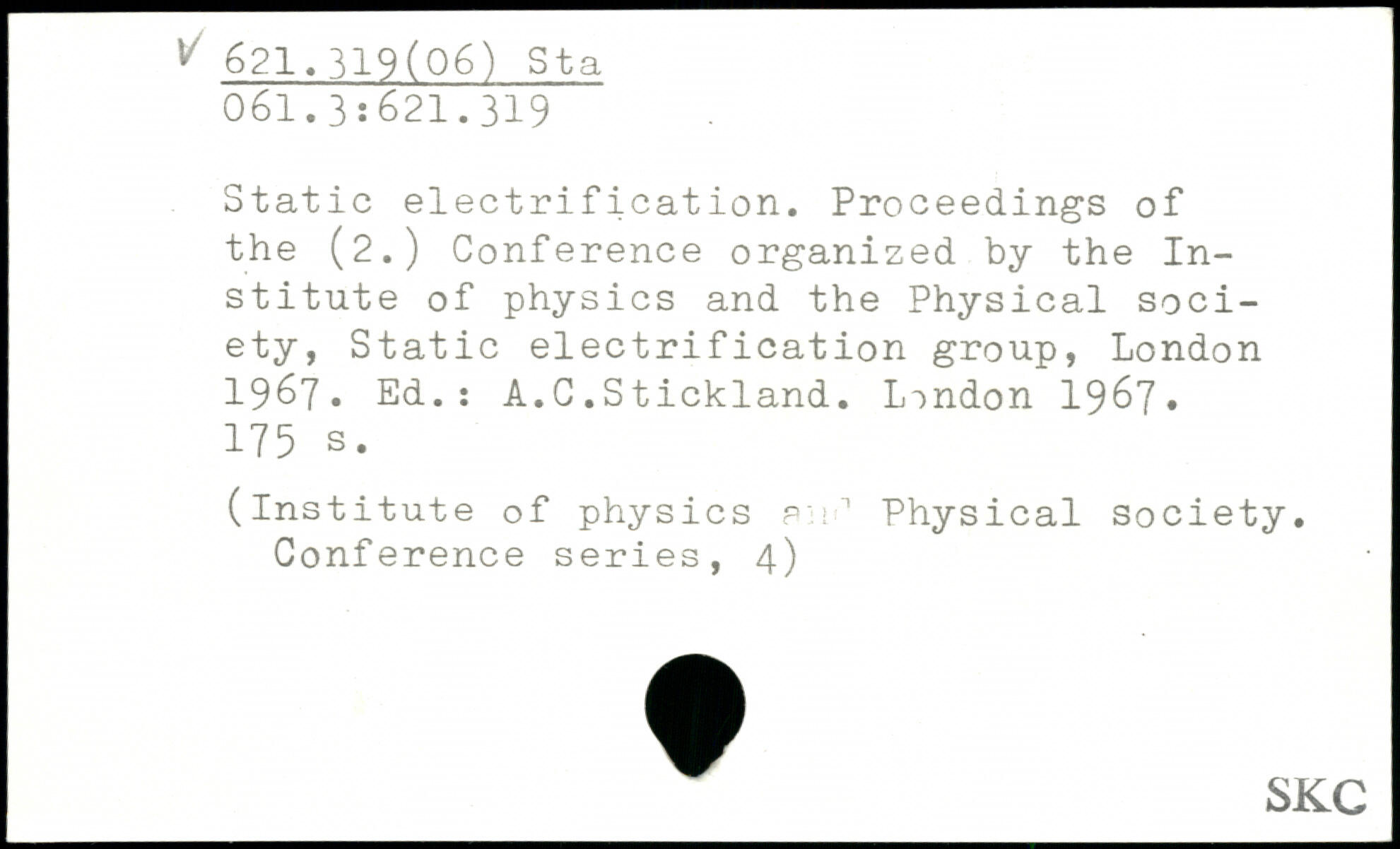 Static electrification. Proceedings of the (2.) Conference organized by the Institute of physics and the Physical society, Static electrification group