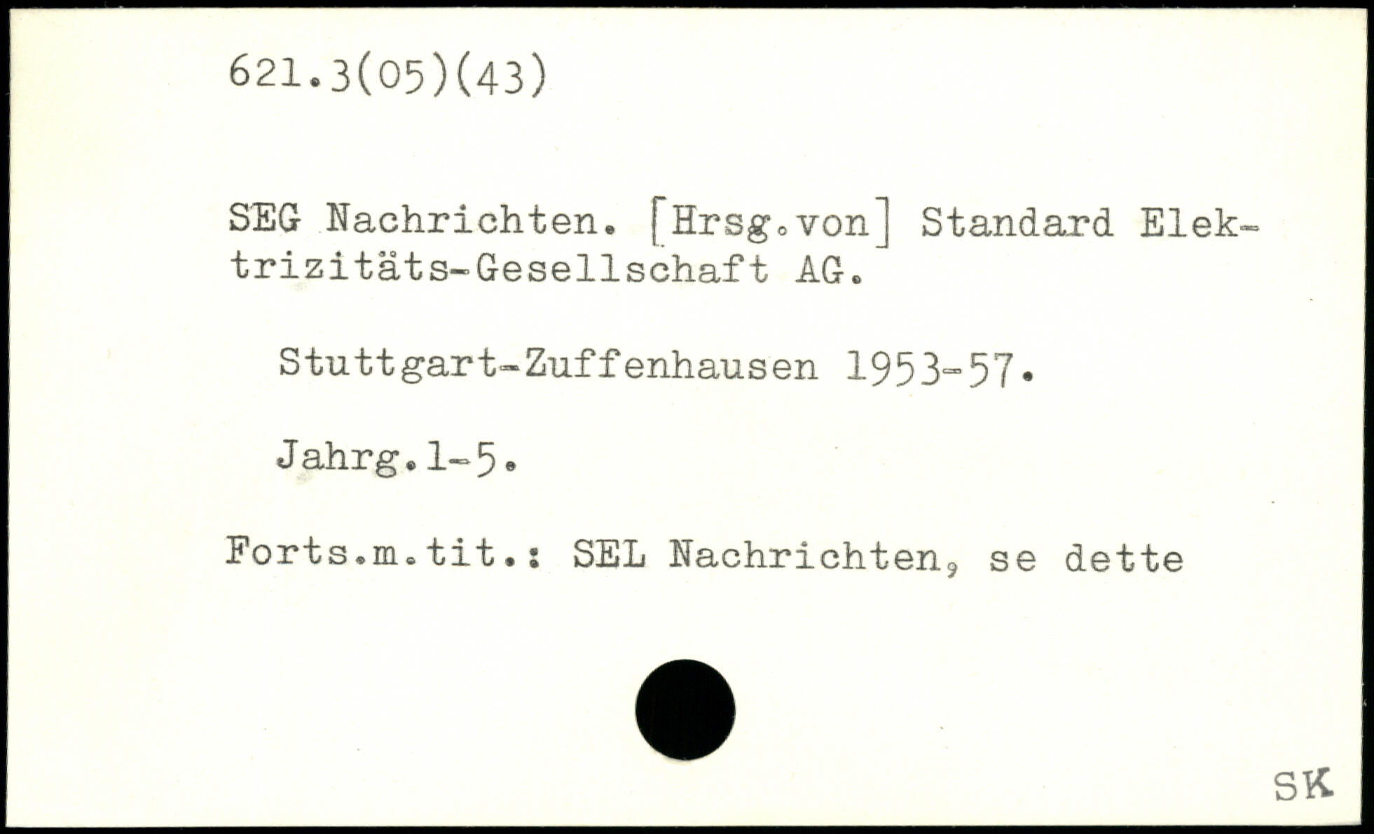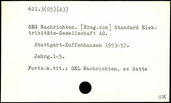 SEG Nachrichten. [Hrsg.von] Standard Elek-trizitäts-Gesellschaft AG. Stuttgart-Zuffenhausen 1953-57. J ahrg.1-5. Forts.m. tit.: SEL Nachrichten,, se dette