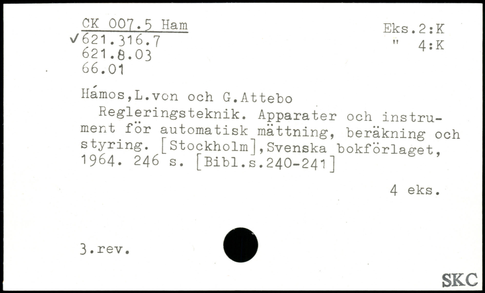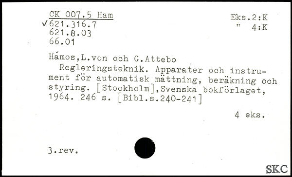 Regleringsteknik. Apparater och instrument for automatisk mättning, beräkning och [ St ockholm ], Svenska bokförlaget, 1964.