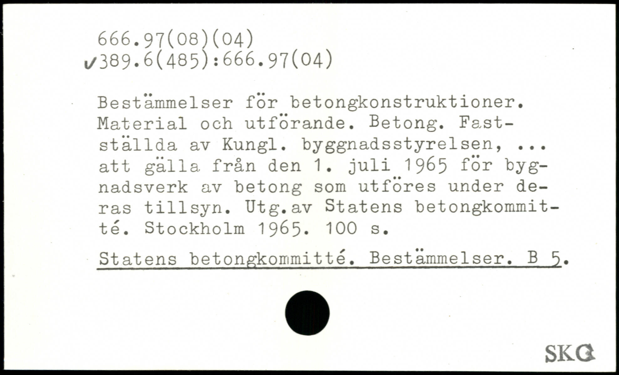 Bestämmelser för betongkonstruktioner. Material och utförande. Betong. Fastställda av Kungl. byggnadsstyrelsen, ... att gälla från den 1. juli 1965 för byg-nadsverk av betong som utföres under deras tillsyn. Utg.av Statens betongkommitté.