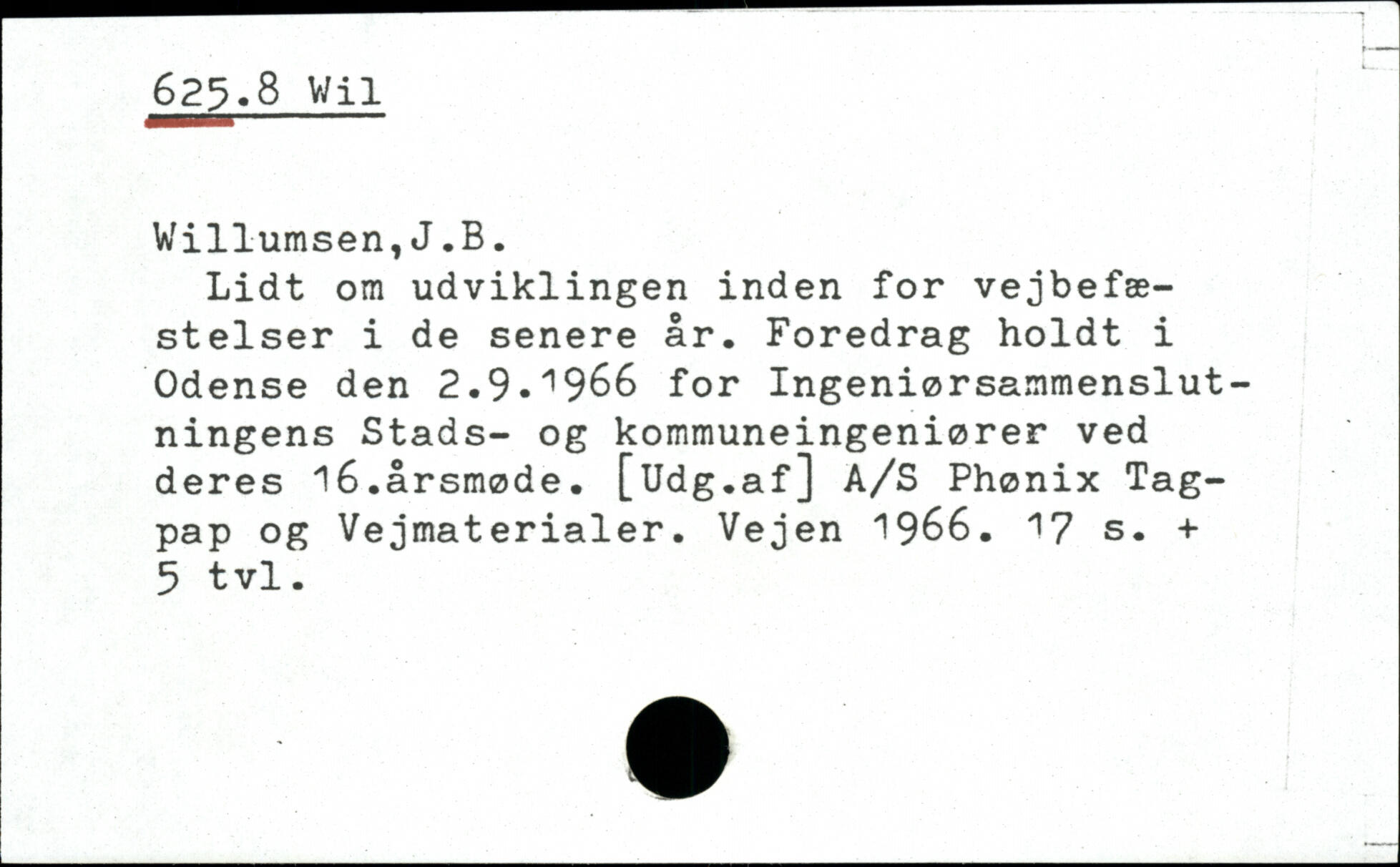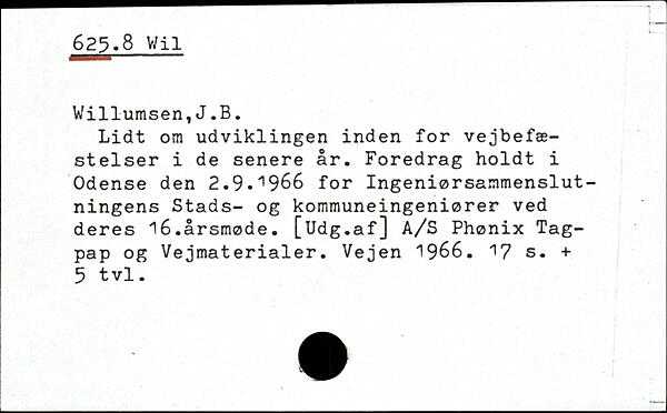 Lidt om udviklingen inden for vejbefæstelser i de senere år. Foredrag holdt i Odense den 2.9.1966 for Ingeniørsammenslutningens Stads- og kommuneingeniører ved deres 16.årsmøde. [Udg.af] A/S Phønix Tagpap og Vejmaterialer. Vejen 1966.