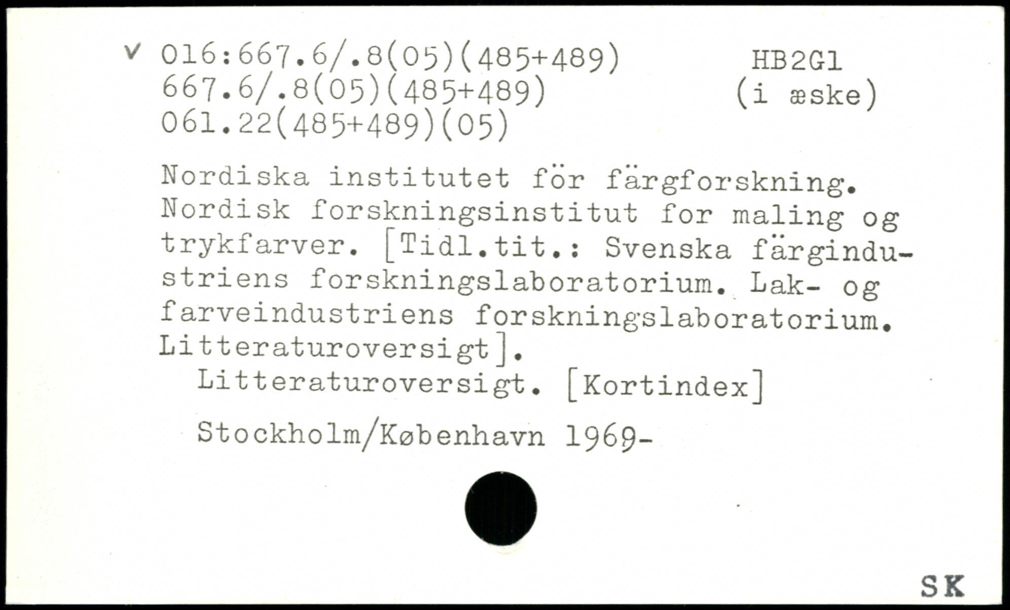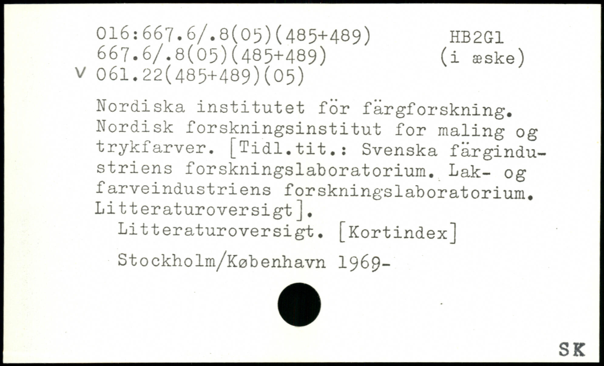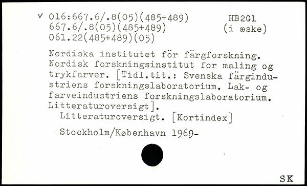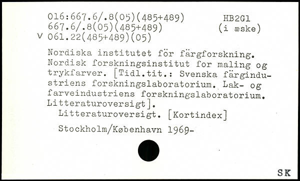 Nordiska institutet för färgforskning. Nordisk forskningsinstitut for maling og trykfarver. [Tidl.tit.: Svenska fargindu-striens forskningslaboratorium. Lak- og farveindustriens forskningslaboratorium. Litteraturoversigt]. Litteraturoversigt. [Kortindex] Stockholm/