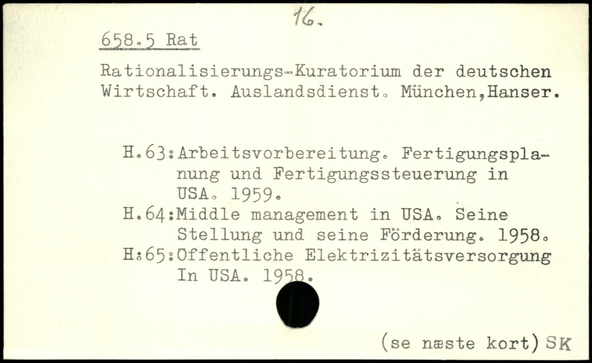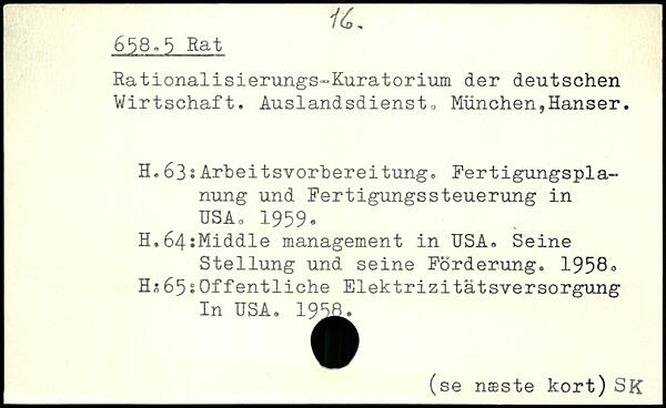 Rationalisierungs-Kuratorium der deutschen Wirtschaft. Auslandsdienst. München?Hanser. H.63:Arbeitsvorbereitung. Fertigungsplanung und Fertigungssteuerung in USA. 1959, H.64:Middle management in USA, Seine Stellung und seine Förderung. 1958, Hs 65 2 öffentliche Elektrizitätsversorgung In USA. 1^^ (se næste kort) SK