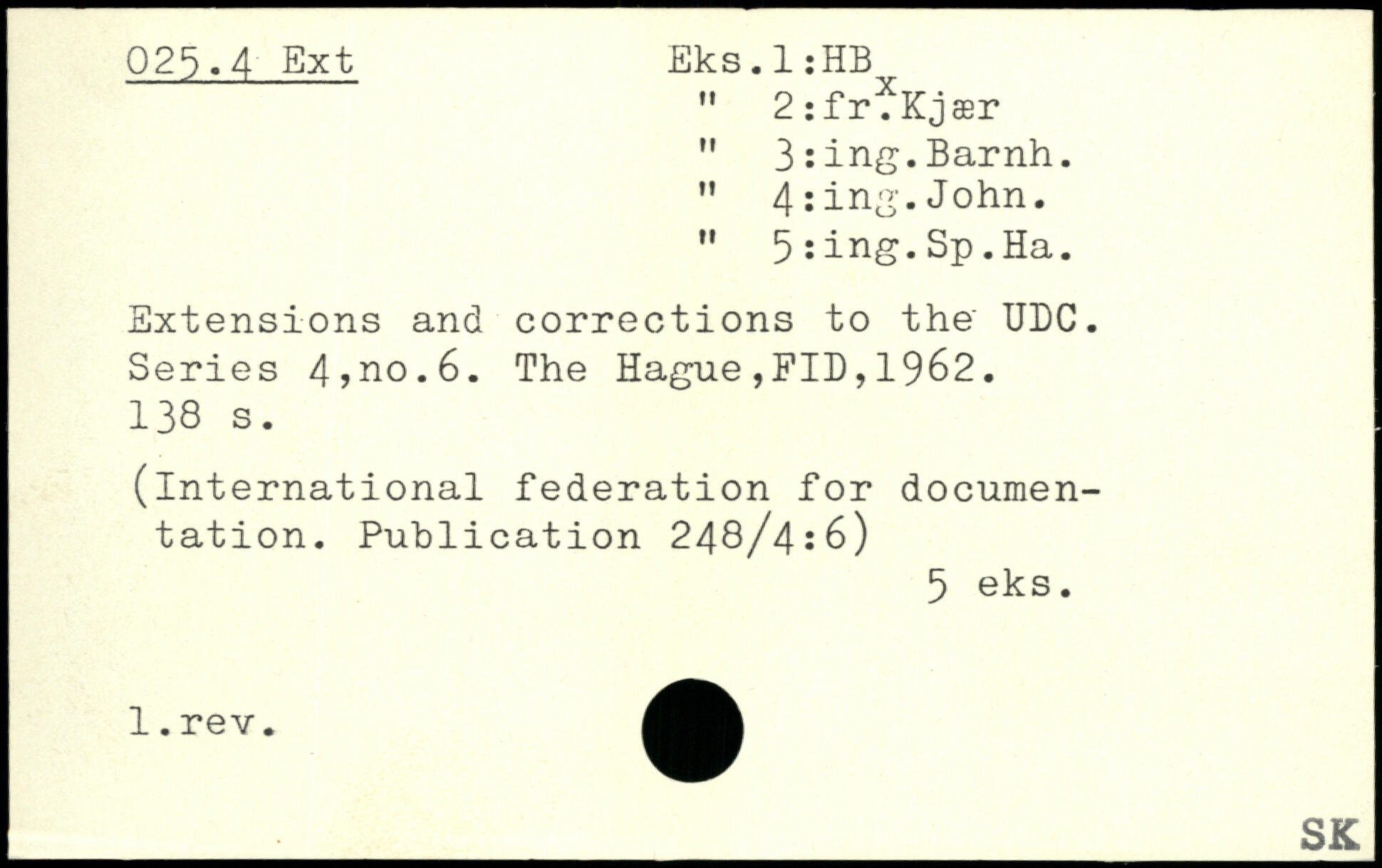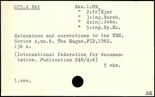 " 2:fr.Kjær " 3:ing.Barnh. " 4:ing.John. " 5:ing.Sp.Ha. Extensions and corrections to the UDC. Series 4?no.6.