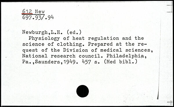 Physiology of heat regulation and the science of clothing. Prepared at the re- j quest of the Division of medical sciences, National research council. Philadelphia, Pa.,Saunders,19^9, ^