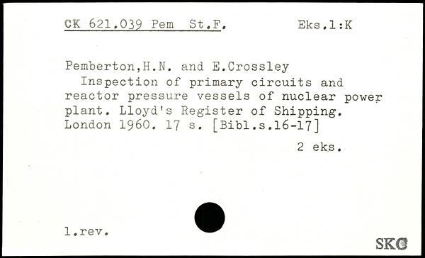 Inspection of primary circuits and reactor pressure vessels of nuclear power plant. Lloyd's Register of Shipping.