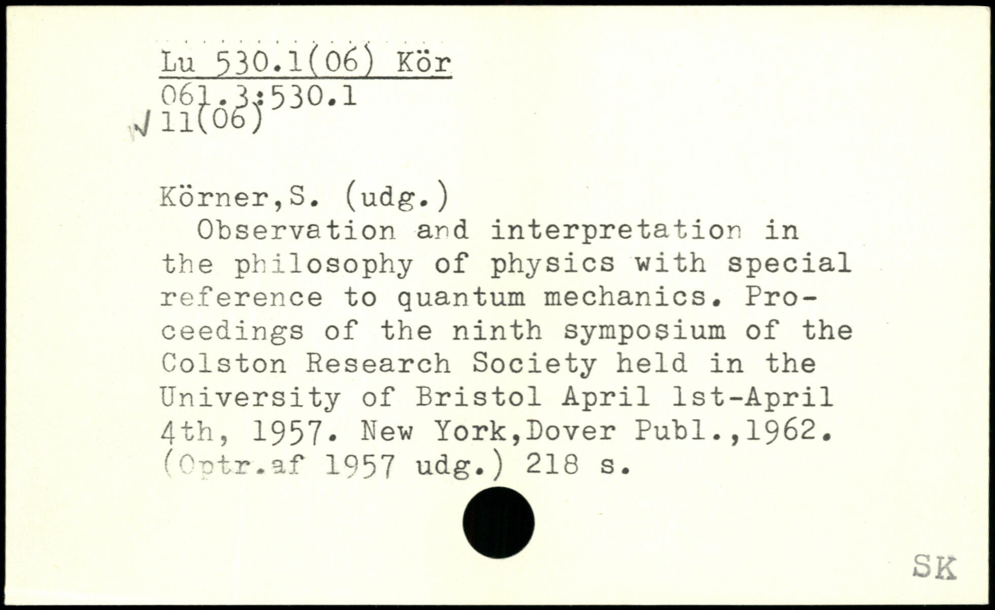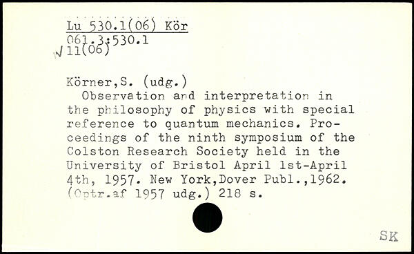 Observation ard interpretation in the philosophy of physics with special reference to quantum mechanics. Proceedings of the ninth symposium of the Colston Research Society held in the University of Bristol April Ist-April 4th, 1957.