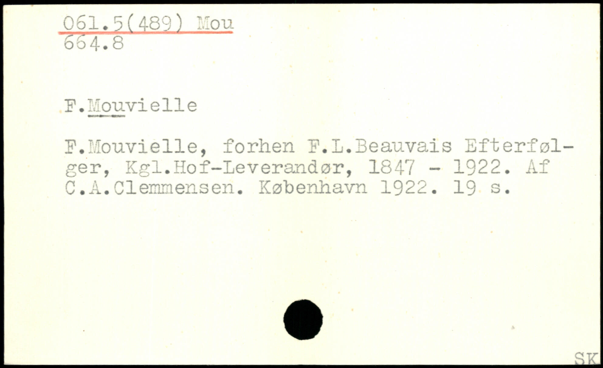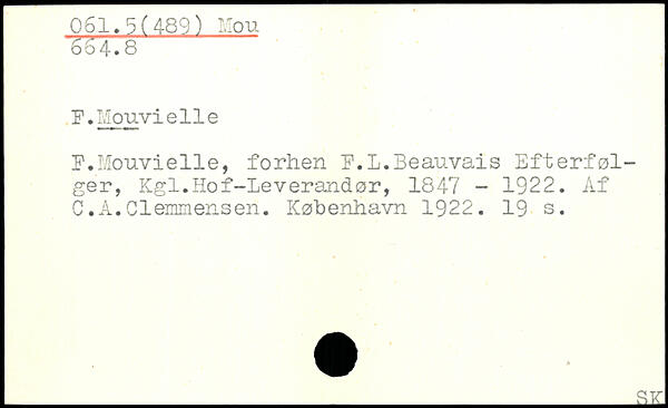 F.Mouvielle, forhen P.L.Beauvais Efterfølger, Kgl.Hof-Leverandør, 1847 - 1922. Af C.A.Clemmensen.