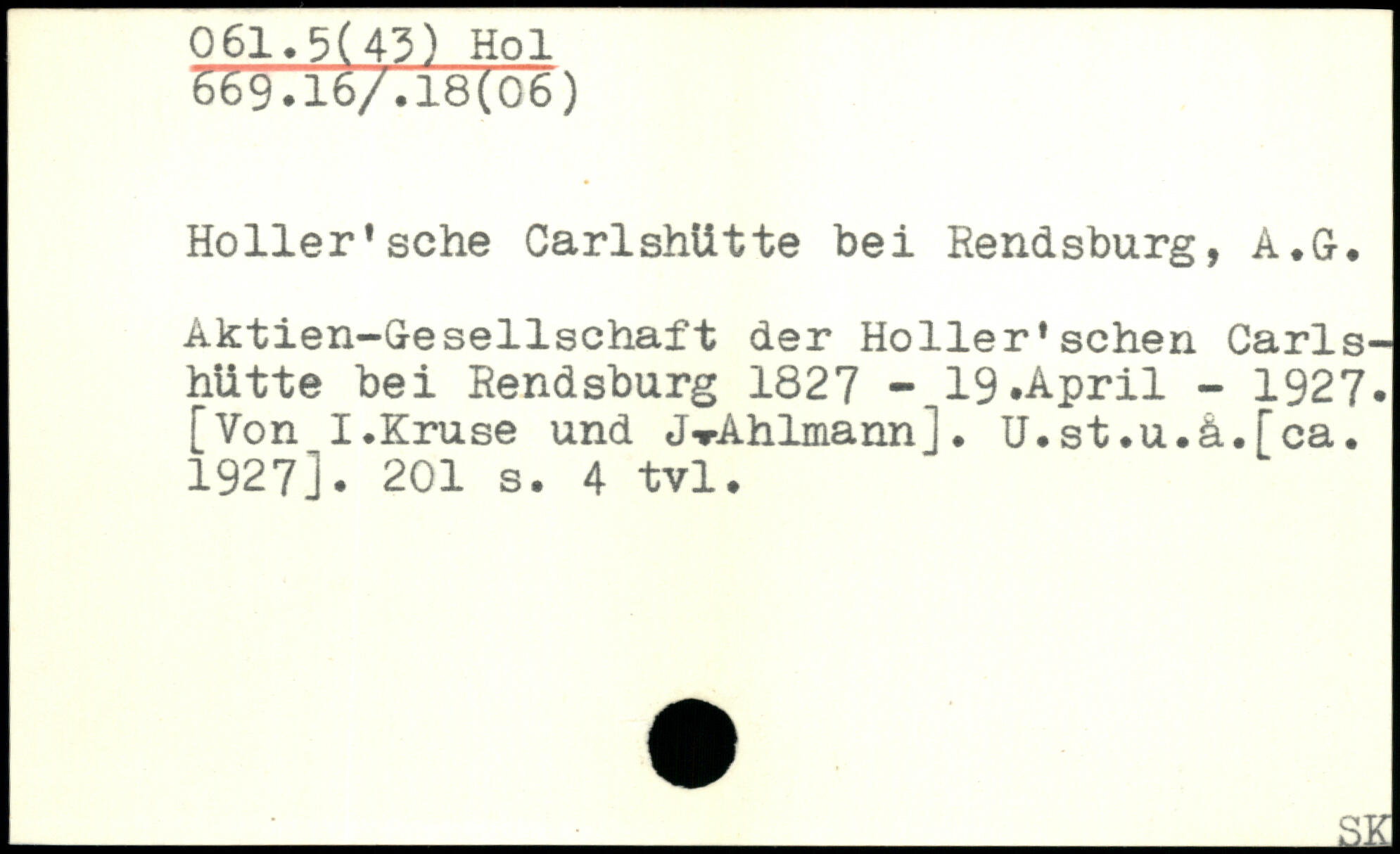 Holler'sehe CarlshUtte bei Rendsburg, A.G. Äktien-Gesellschaft der Holler'sehen Carls-hütte bei Rendsburg 1827 - 19.April - 1927. [Von I.Kruse und J-rAhlmann]. U.st.u.ä.[ca. 1927].