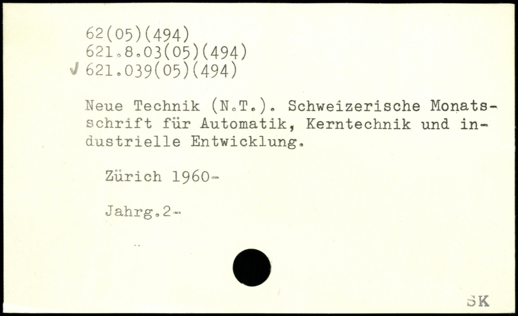 Neue Technik. (N.T.). Schweizerische Monats-Schrift für Automatik, Kerntechnik und in-dustrielle Entwicklung, Zürich 1960- J ahrg <, 2 , _oK