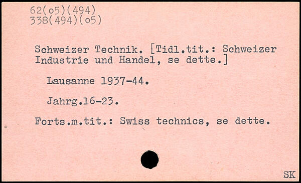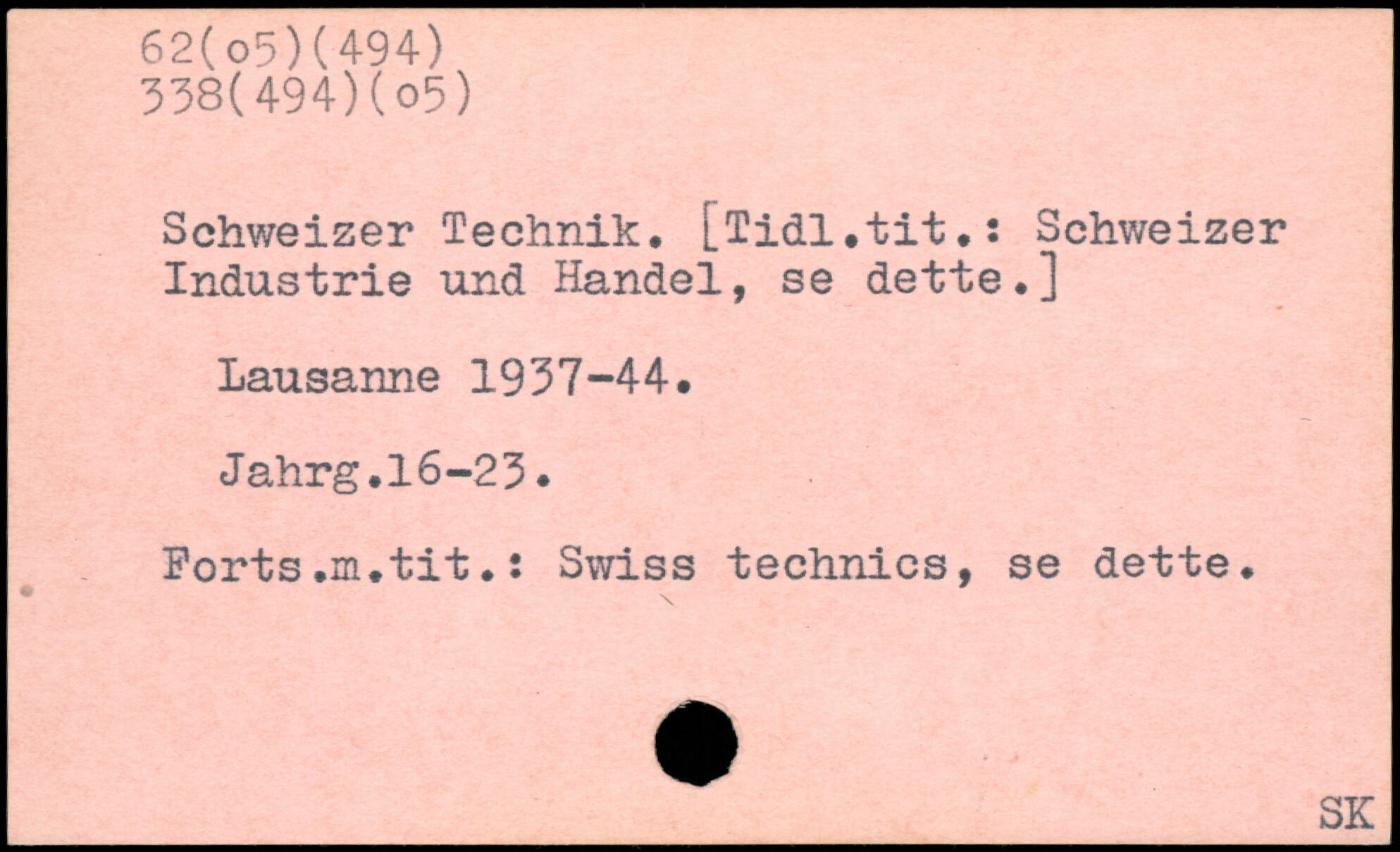 Schweizer Technik. [Tidl.tit.: Schweizer Industrie und Handel, se dette.] Lausanne 1937-44. Jahrg.16-23. Forts.m.tit.î Swiss technics, se dette.