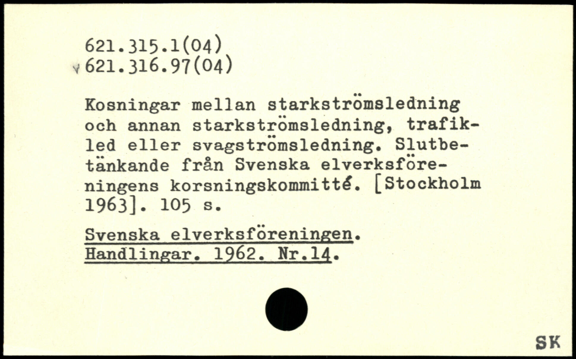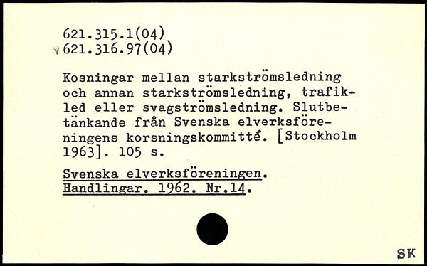 Kosningar mellan starkströmsledning och annan starkströmsledning, trafikled eller svagströmsledning. Slutbetänkande från Svenska elverksföre-ningens korsningskommitté.