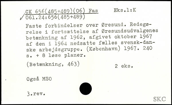 Faste forbindelser over Øresund. Redegørelse i fortsættelse af Øresundsudvalgenes betænkning af 1962, afgivet oktober 19^7 af den i 1964 nedsatte fælles svensk-danske arbejdsgruppe. (København) 1967