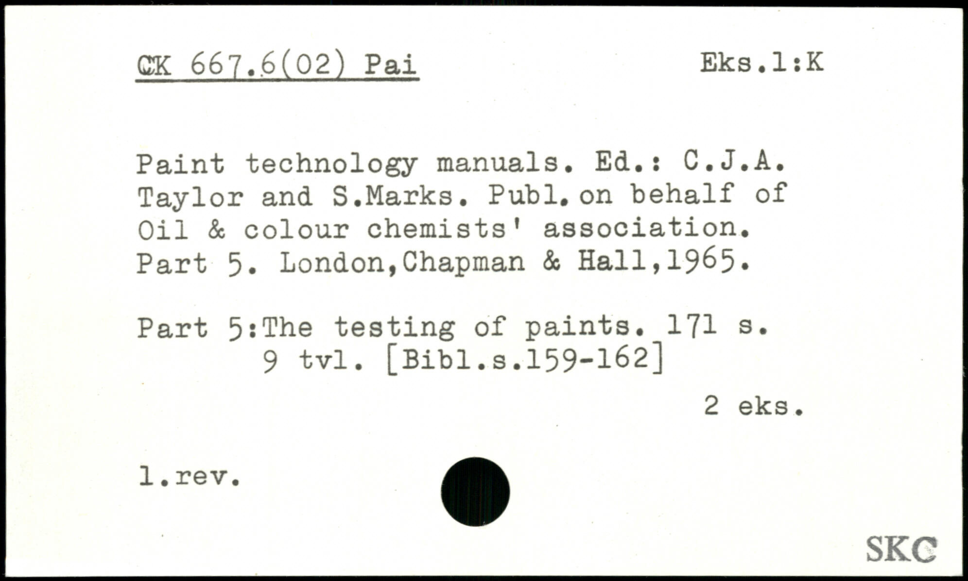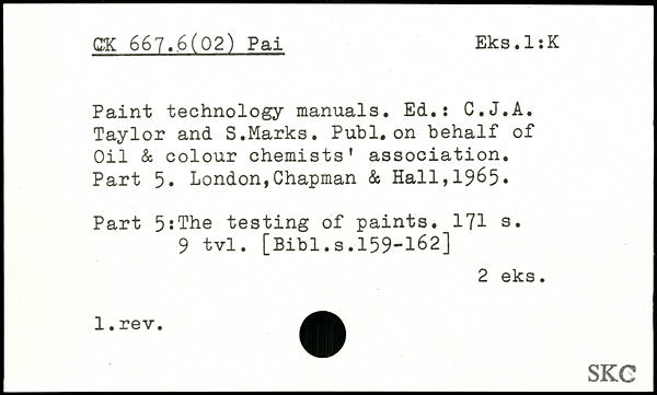 Paint technology manuals. Ed.s C.J.A. Taylor and S.Marks. Publ. on behalf of Oil & colour chemists' association. Part 5. London,Chapman & Hall,19&5. Part 5:The testing of paints.