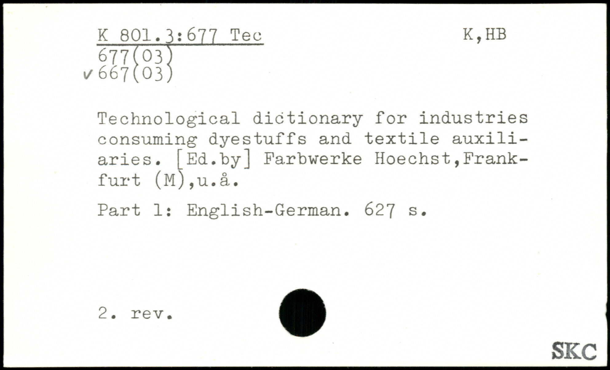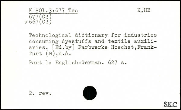 Technological dictionary for industries consuming dyestuffs and textile auxiliaries. [Ed.by] Farbwerke Hoechst,Frankfurt (m),u.â. Part 1: English-German.
