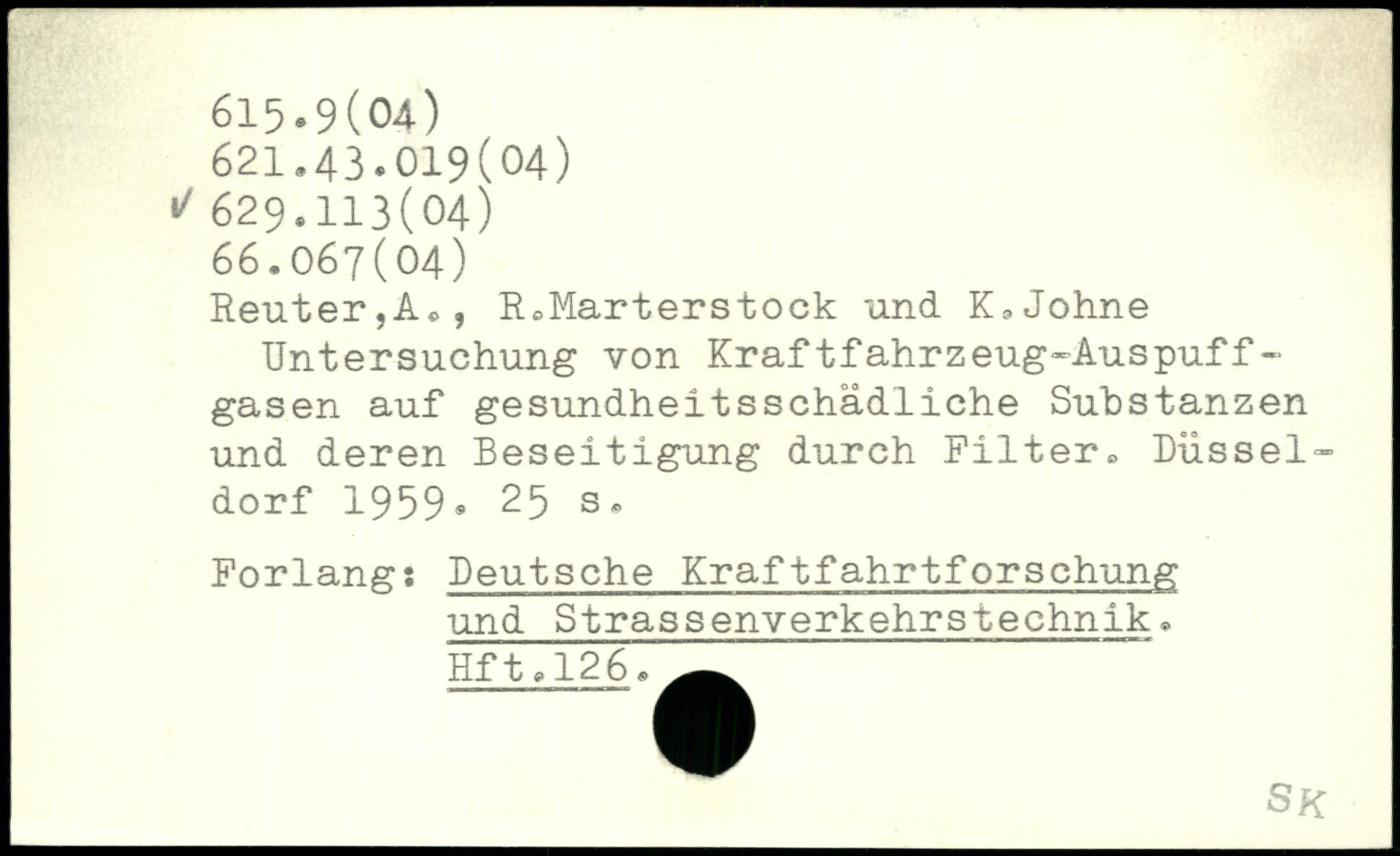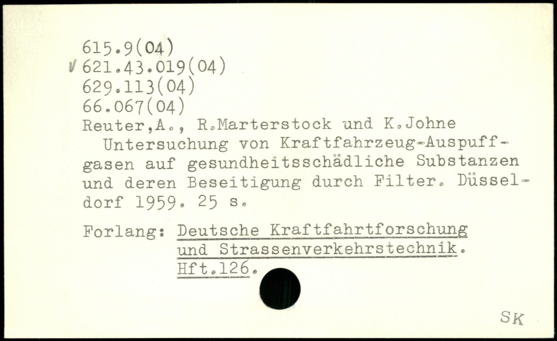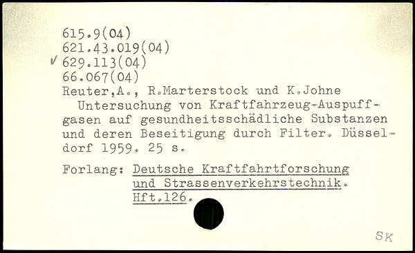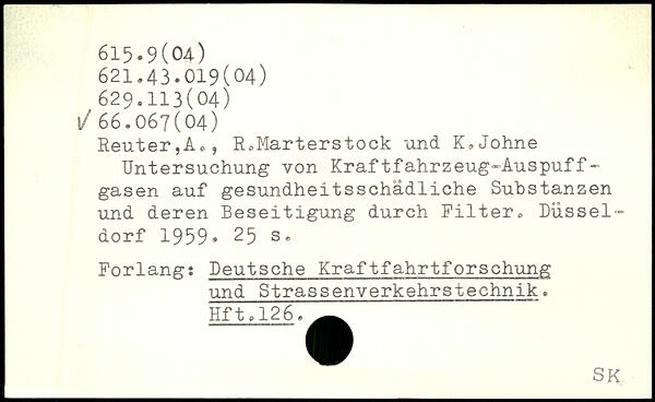 ReuterjA,, R.Marterstock und K.Johne Untersuchung von Kraftfahrzeug-Auspuff-gasen auf gesundheitsschädliche Substanzen und deren Beseitigung durch Filter. Düsseldorf 1959.