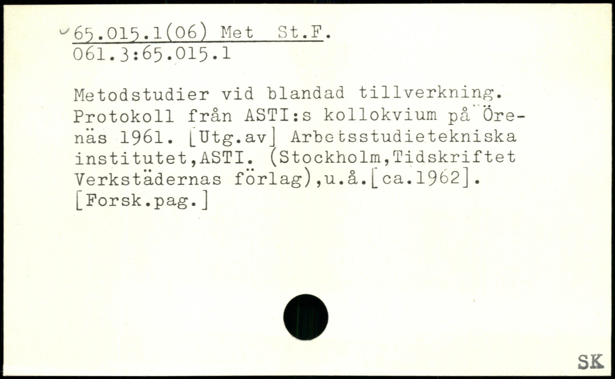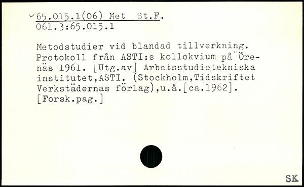 Metodstudier vid blandad tillverkning. Protokoll från ASTI:s kollokvium på Örenäs 1961. LUtg.avJ Arbetsstudietekniska institutet,ASTI. (Stockholm,Tidskriftet Verkstadernas forlag),u.å.[ca. 1962].