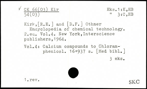 Kirk,[R.E.J and [D.F.] Othmer Encyclopedia of chemical technology. 2.ea.