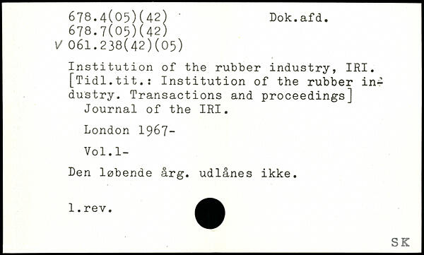 Institution of the rubber industry, IRI. [Tidl.tit.: Institution of the rubber industry. Transactions and proceedings] Journal of the IRI. London 196 7— Vol.l- Den løbende årg. udlånes ikke.