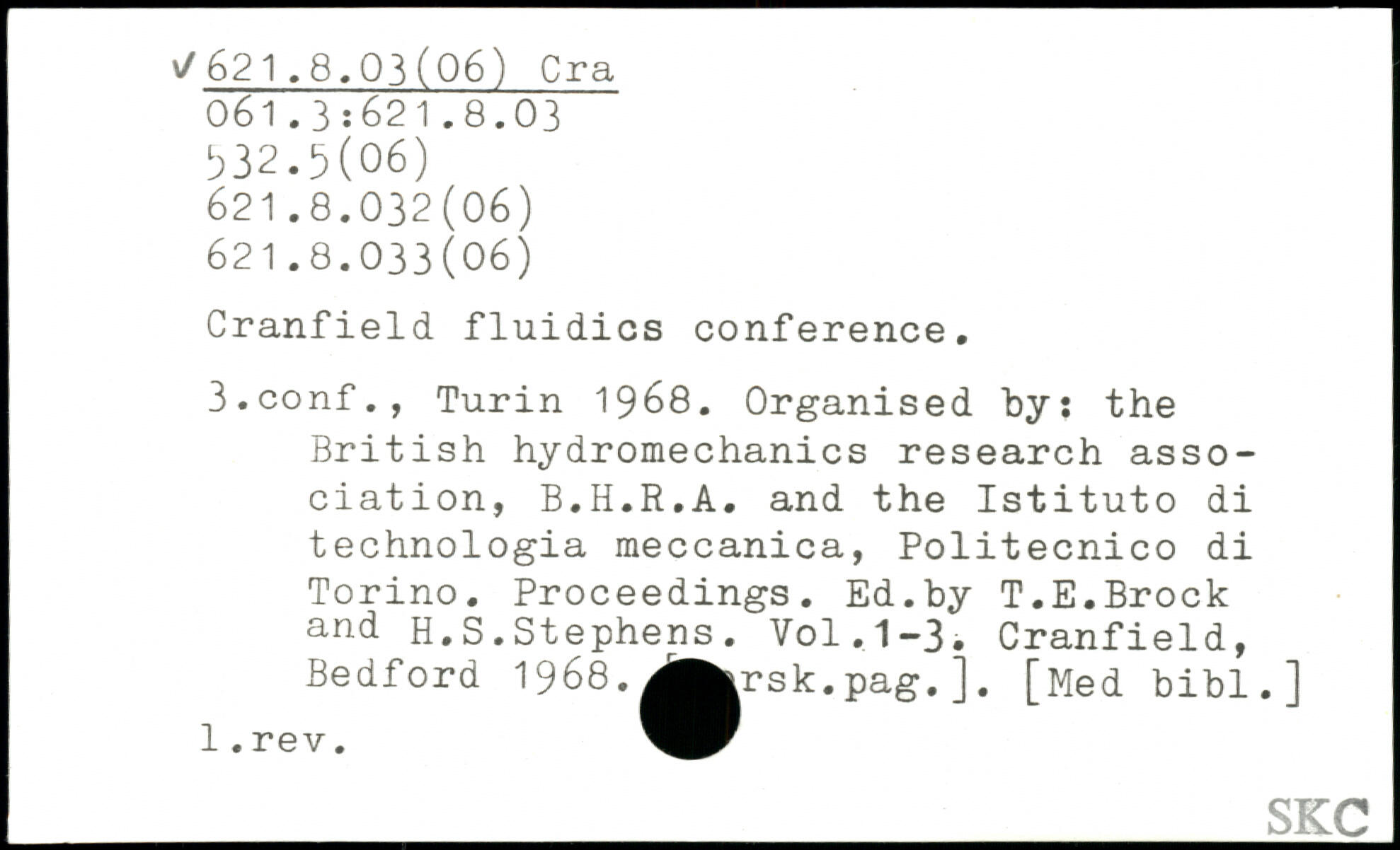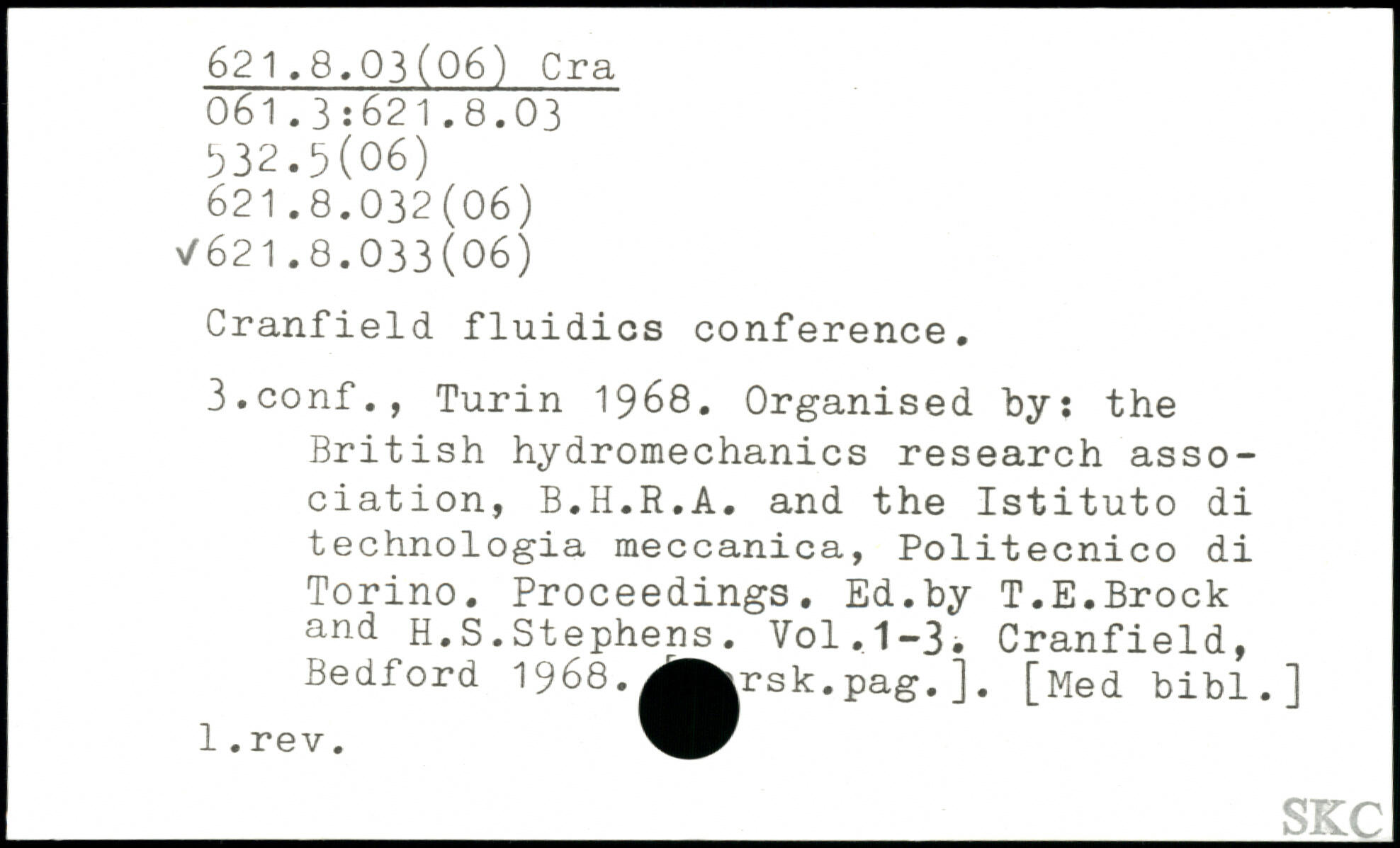 Cranfield fluidics conference. 3.conf., Turin 1968. Organised by: the British hydromechanics research association, B.H.R.A. and the Istituto di technologia meccanica, Politecnico di Torino. Proceedings. Ed.by T.E.Brock and H.S.Stephens.
