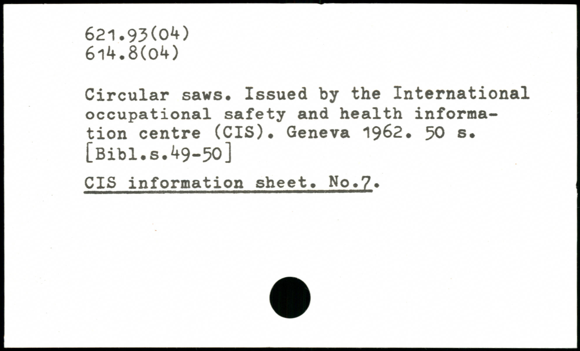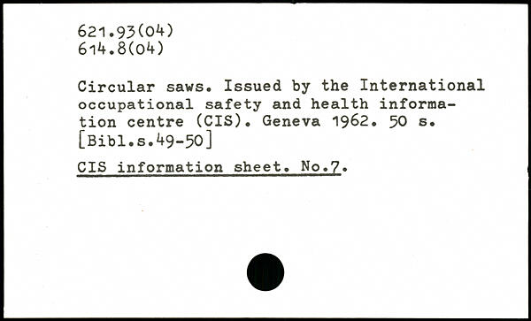 Circular saws. Issued by the International occupational safety and health information centre (CIS). Geneva 19&2.