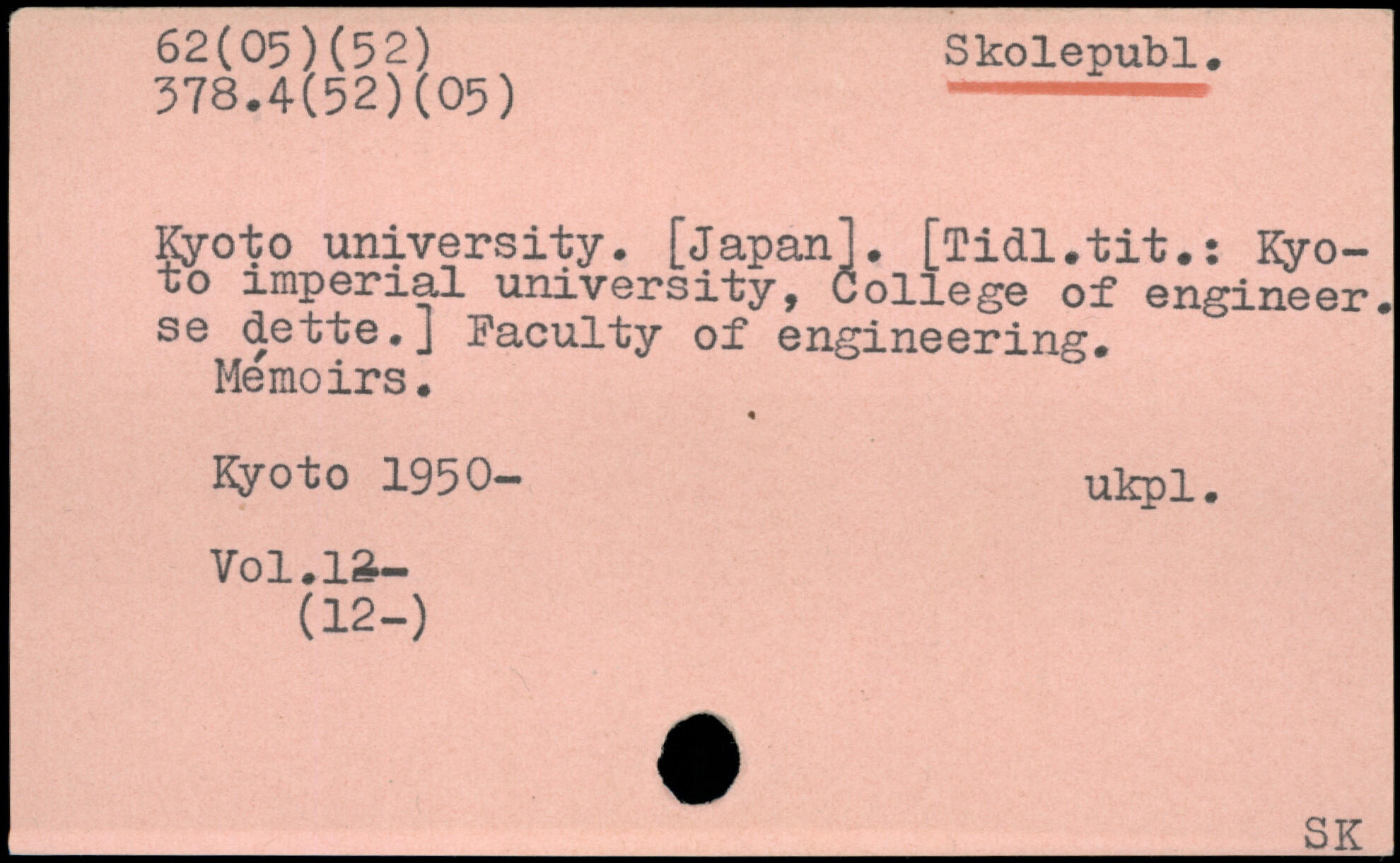 Kyoto university, [japan]. [Tidl.tit.: Kyoto imperial university, College of engineer, se dette.j Faculty of engineering. Memoirs. Kyoto 1950- ukpl. voi.ia-