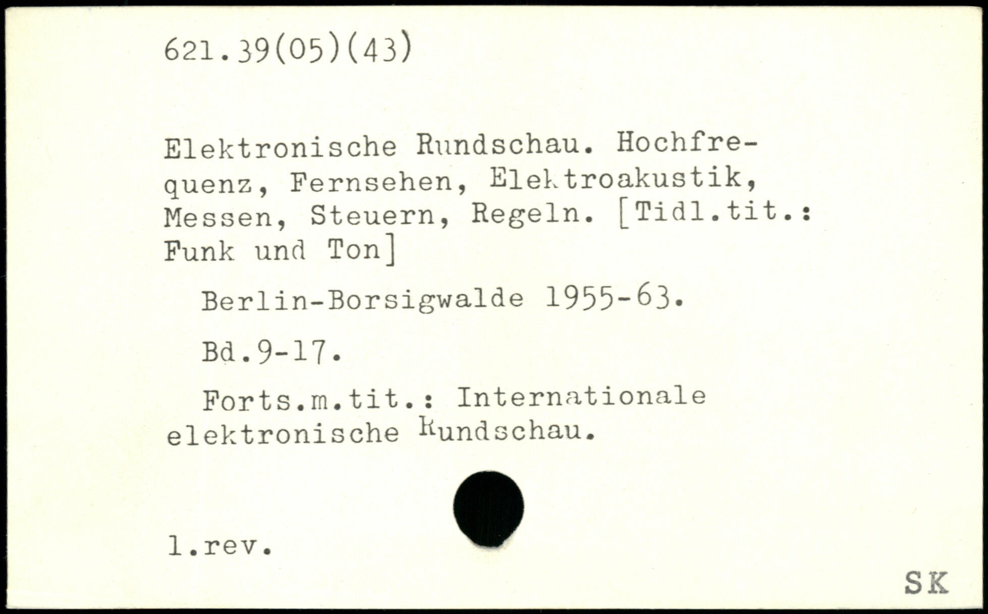 Elektronische Rundschau. Hochfrequenz, Fernsehen, Elektroakustik, Messen, Steuern, Regeln. [Tidl.tit.: Funk und Ton] Berlin-Borsigwalde 1955-63-